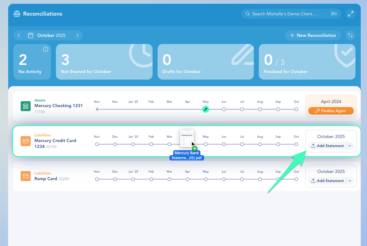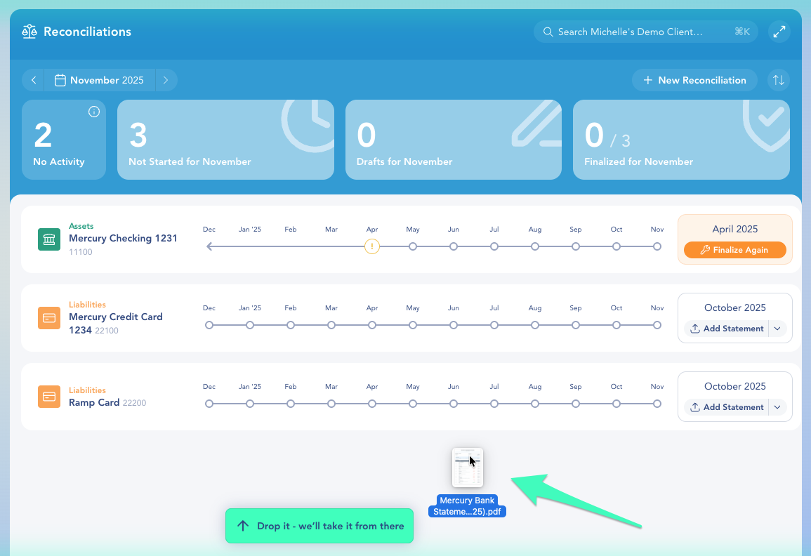 Drag and drop your statement PDF into any white or open space on the Reconciliations screen.