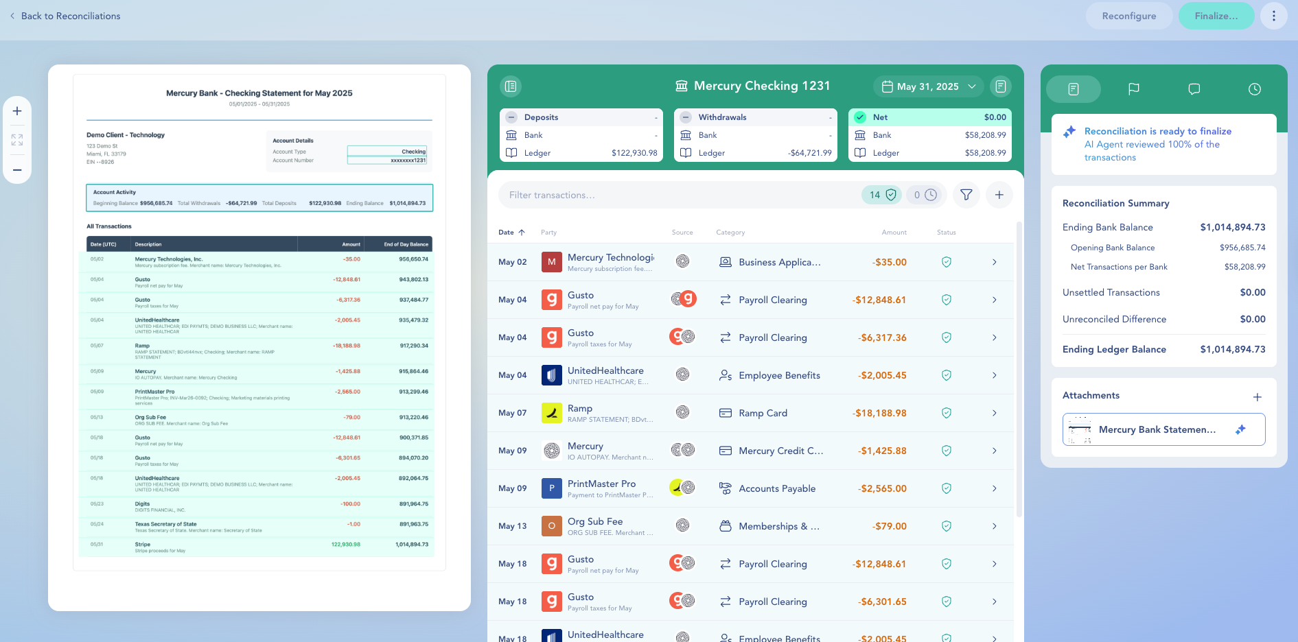 Click Finalize → Confirm to complete and lock the reconciliation.
