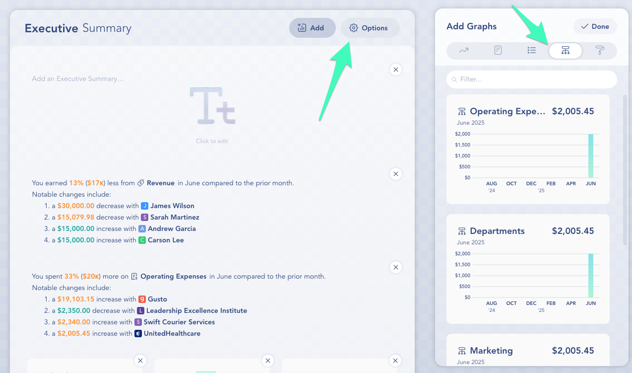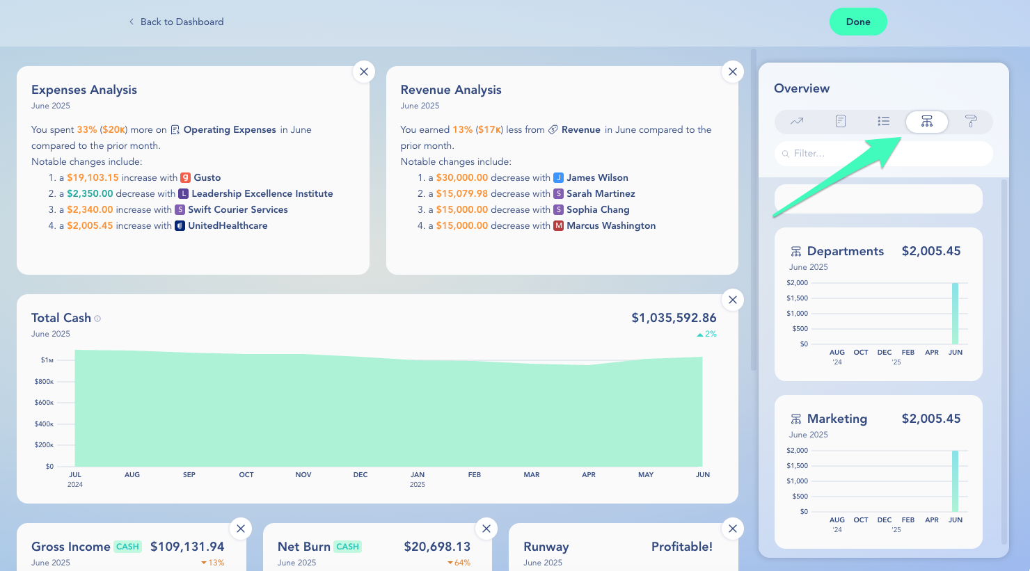 This lets you filter and break down P&L reports to compare revenue and expenses across departments.