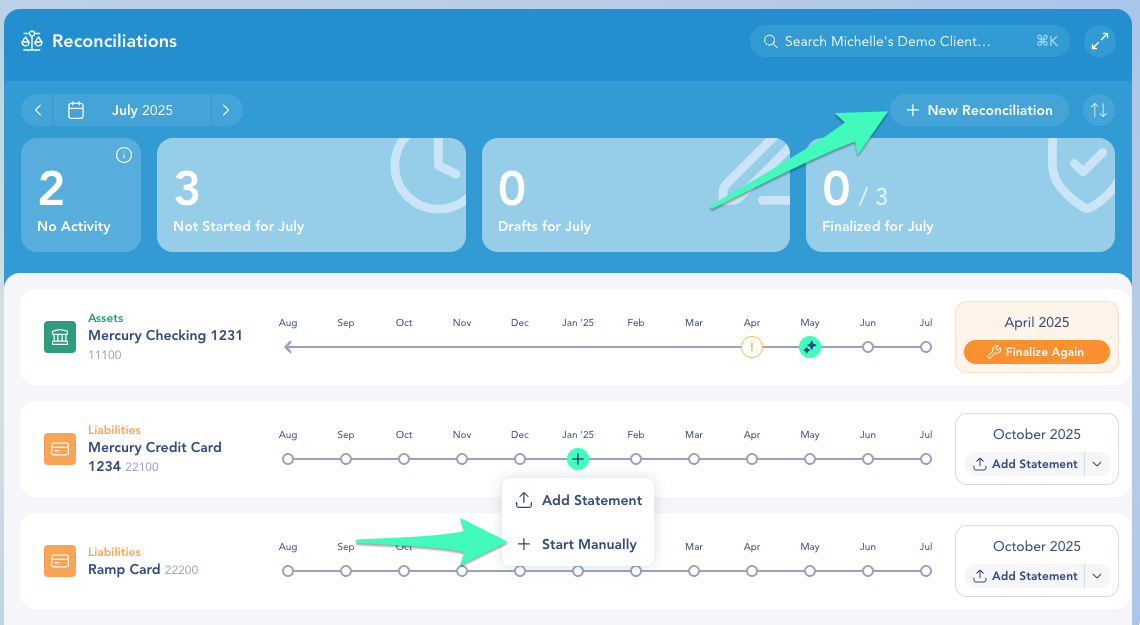 Click “+ New Reconciliation” at the top of the screen.
