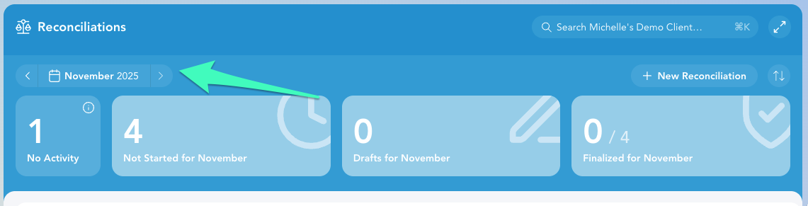 The Reconciliation Dashboard gives you a quick view of your client’s progress each month — including what’s started, what’s pending, and which reconciliations are finalized.